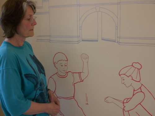 Wer sich im Foyer etwas Zeit nimmt und möglich auch etwas Ruhe dabei mitbringt, sollte sich in das gelungene Zusammenspiel von historischen Gebäuden und Menschen in ihrer Zeit hineindenken. Die Künstlerin hat drei geschichtlich bedeutsame Ereignisse für Neckarburken illustriert. Sie beginnt mit der Darstellung des Westtores des Kohortenkastells etwa im Jahre 145 nach Christus. Inschrift und Funktion des Baues sind gut zu erkennen, bleiben aber durch den gewählten Silberton wirklich im Hintergrund. Im Vordergrund spielen zwei Neckarburkener Kinder der Römerzeit mit Knöchelchen damals beliebtes Spiel. Sie strahlen Zufriedenheit aus, die man mit dem Kohortenkastell im Rücken damals in Neckarburken gesichert vor germanischen Angriffen wohl auch haben durfte.
