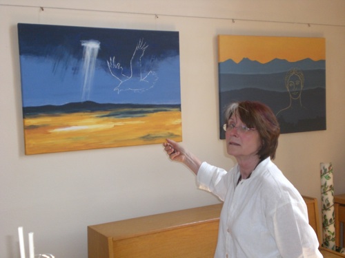 Auch die neueren Himmel- und Wolkenbilder sind Ausdruck von Gemütszuständen. Sie harmonieren farblich überraschend gut mit der Kopie eines Raffaelgemäldes in der Friedenskirche. Die Malerin führt die Betrachter von realitätsnahen Bildern zur Abstraktion, betonend, dass jede Art der Wiedergabe einer Wahrnehmung eine Abstraktion des Gesehenen sei. So verleitet der Blick einer jungen Frau an der Seitenwand der Kirche den Gottesdienstbesucher zu Spekulationen über eine vage Zukunft. Ein geflügeltes Phantasiewesen, dem eine Schlange seinen Apfel auf das Knie legt, regt Assoziationen zu biblischen Themen an. Hinter dem Altar geben zwei neuere Landschafts-Visionen unterschiedliche Impulse für deren Betrachtung und Deutung.